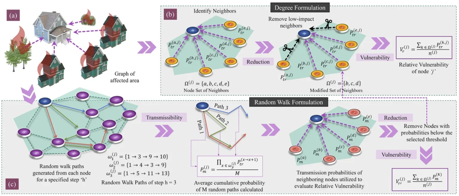 La investigación comienza introduciendo un modelo gráfico de incendios forestales, que sirve de base al estudio. El modelo representa las intrincadas interacciones entre edificios y vegetación en zonas afectadas por incendios forestales. Para aumentar la precisión del modelo, los investigadores incluyen nodos que tienen en cuenta tanto la vegetación forestal como la urbana. Estos dos tipos de vegetación son reconocidos como factores influyentes en la determinación de la intensidad y la velocidad de propagación del fuego. Además, el modelo incorpora varias características de los edificios, como el tipo de cubierta, los aleros, el tipo de tejado, el tipo de ventilación, la valla y el cristal de la ventana, ya que estos factores afectan significativamente a la vulnerabilidad de una estructura a los incendios forestales.