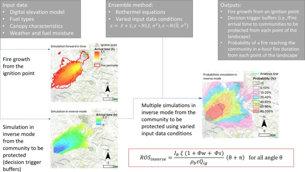 Para demostrar el concepto de modelización de desencadenamiento de decisiones, el estudio utilizó datos del incendio de Tubbs, uno de los incendios forestales más destructivos de California. El análisis realizó simulaciones de incendios hacia atrás en el tiempo, desde los puntos de ignición seleccionados hasta el límite de la WUI en torno a Santa Rosa. Las simulaciones estimaron el tiempo que tardaría un incendio en llegar a la WUI, y los resultados se compararon con la progresión real del incendio para validar la exactitud del método de modelización del desencadenamiento de decisiones.