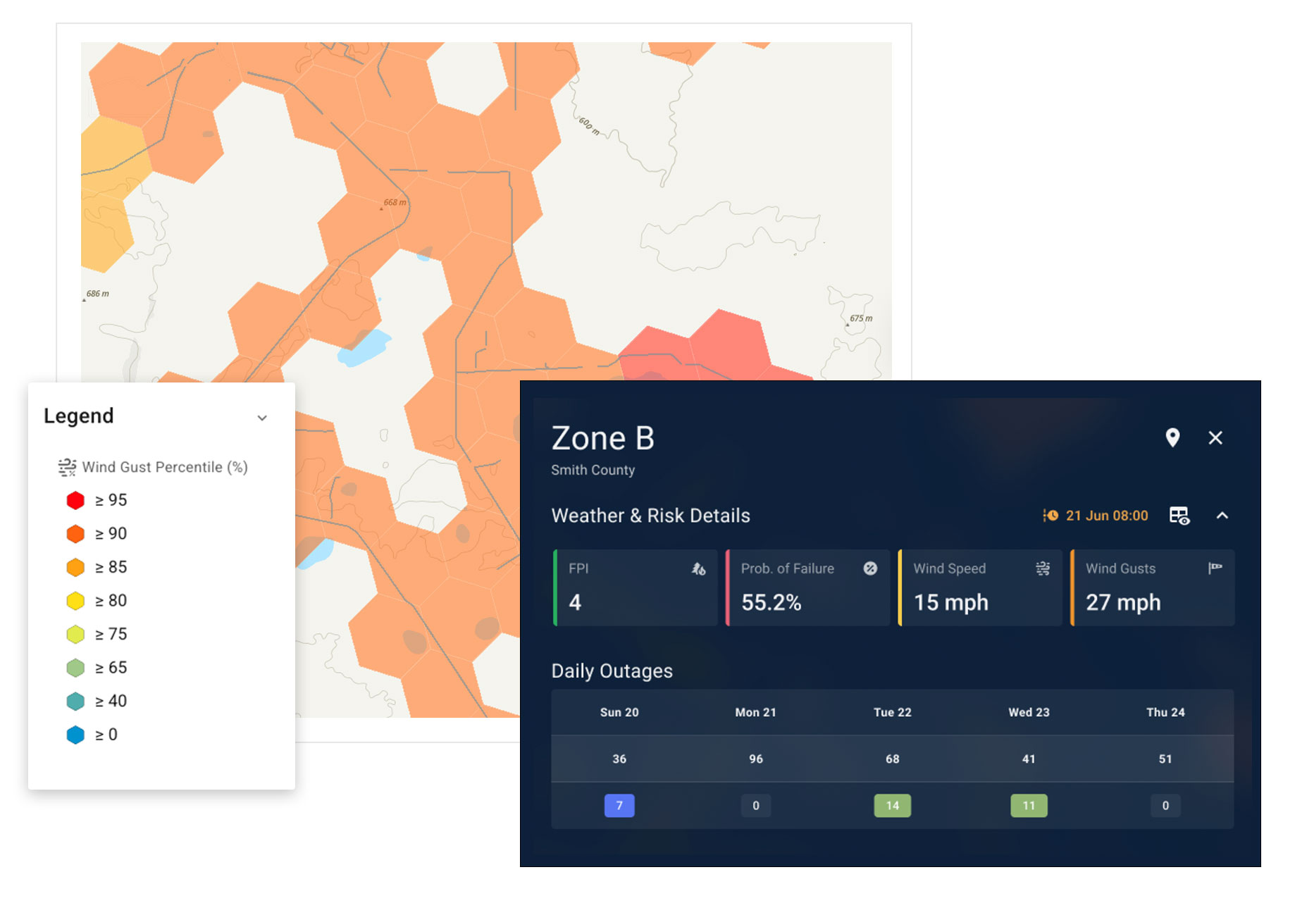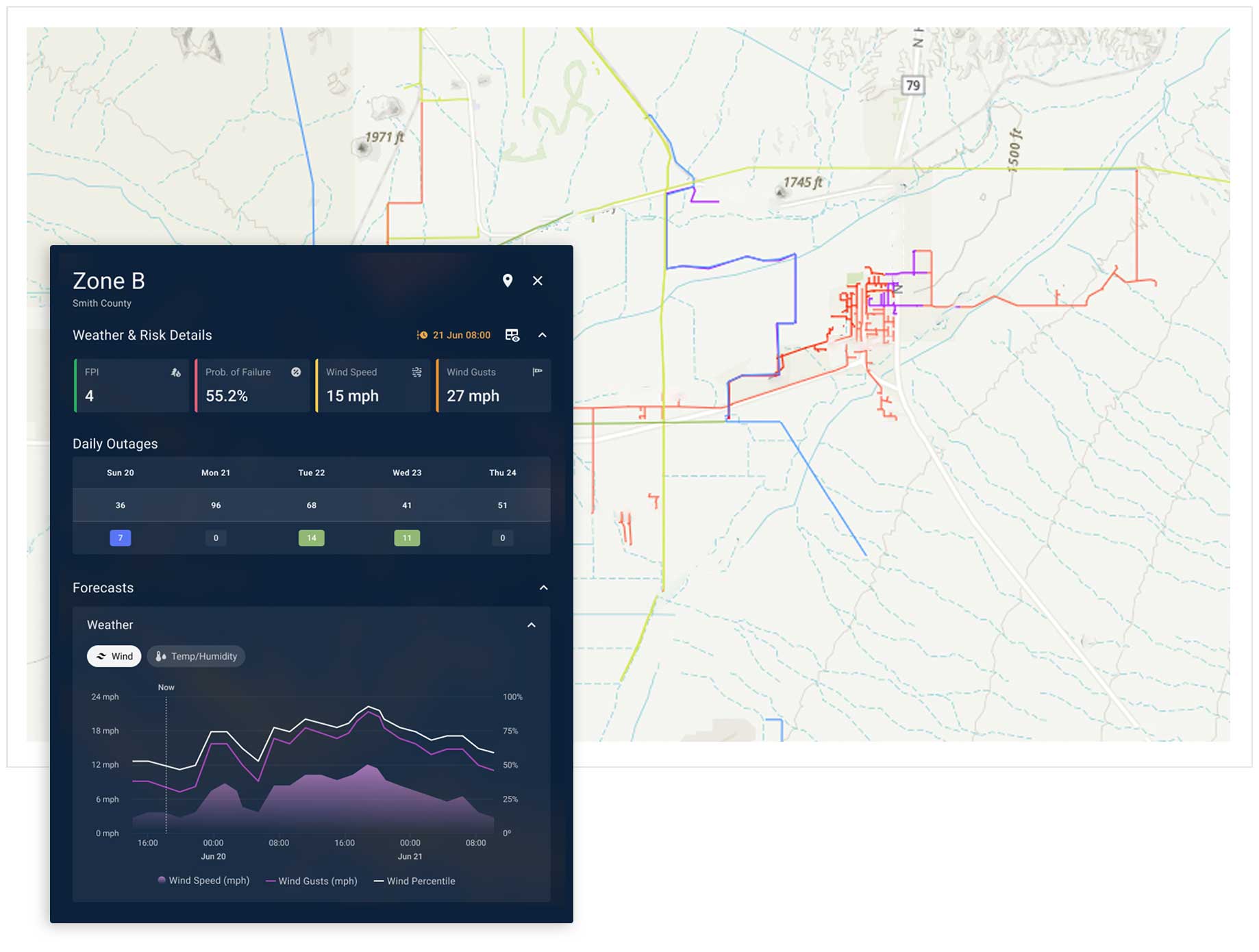 Know days ahead when weather conditions could cause problems. When fires start, instantly see where they might spread and which of your assets could be in danger. Make power shutoff decisions that protect communities without unnecessarily affecting thousands of customers.